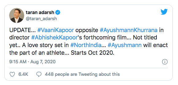 वहीं खबर ये भी आ गई है कि इस फ़िल्म में आयुष्मान संग वाणी कपूर रोमांस करेंगी। फिल्म समीक्षक तरण आदर्श ने ट्वीट कर इस बात की जानकारी दी है कि फिल्म में आयुष्मान संग वाणी कपूर की जोड़ी देखने को मिलेगी। वाणी कपूर ने हाल ही में अपनी दिली इच्छा जाहिर की थी कि वो किसी बायोपिक में काम करना चाहती हैं और अगर को कल्पना चावला पर बन रही हो तो सोने पर सुहागा है। अब वाणी को फिलहाल बायोपिक तो कोई नहीं मिल पाई लेकिन अभिषेक कपूर की इस फिल्म में वो आयुष्मान संग रोमांस जरूर करती नजर आएंगी। बता दें, इस फिल्म से जुड़ी जो जानकारी आई है उसके मुताबिक ये एक रोमांटिक कॉमेडी ड्रामा फिल्म होगी जिसमें आयुष्मान एक एथलीट की भूमिका में नजर आएंगे।